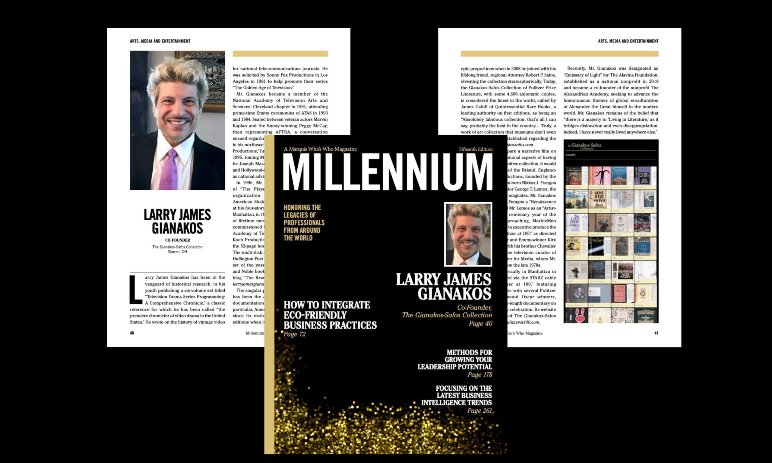 A lifelong collector of rare first editions, author and United States Presidential letters, and related ephemera, Larry James Gianakos’ gathering of Pulitzer Prize literature assembled over the course of almost four decades is now considered by many antiquarian booksellers to be definitive. A nationally acclaimed writer, historian, and lecturer, Gianakos has been considered the “preeminent historian of American entertainment broadcasting” (J. Fred MacDonald, Choice, June 1988), principally by way of his now classic seven-volume Television Drama Series Programming: A Comprehensive Chronicle, 1947-2008 (Scarecrow Press). He has critically examined dozens of individual dramatic teleplays for several national communications journals, and most recently, authored the liner notes “Resurrection of an Era” for the premiere release of the Archive of American Television in conjunction with Koch/Lorber, named the best DVD boxed set of the year by the Huffington Post. Gianakos is a member of the Upper Great Lakes Chapter of the Academy of Television Arts and Sciences, the Warren High School Distinguished Alumni Hall of Fame, and a lifetime member of The Players, Manhattan’s celebrated theatre organization.